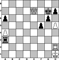 Partie-Notation im PGN-Format [Event "Adventszeit"] [Site "www.mySchach.de"] [Date "2022.11.28"] [Round "1"] [White "Master1"] [Black "borsti"] [ECO "D00"] [WhitemyELO "1305"] [BlackmyELO "1402"] [Result "1-0"] [TimeControl "10/1728000"] [WhiteDays "18"] [BlackDays "20"] [MySchachNr "128267"] 1. d4 d5 2. e3 a6 3. Bd3 Nf6 4. Nf3 Bg4 5. Nbd2 Nc6 6. O-O e6 7. Re1 Bb4 8. c3 Bd6 9. e4 Bf4 10. e5 Ne4 11. Bxe4 dxe4 12. Rxe4 Bxf3 13. Nxf3 Bxc1 14. Rxc1 O-O 15. a4 Qd5 16. Re3 f5 17. c4 Qd8 18. Ng5 Qxg5 19. d5 Rad8 20. Rg3 Qe7 21. f4 Nb4 22. Qe1 Qc5+ 23. Kh1 Qd4 24. Qxb4 b6 25. Qe1 Qxb2 26. dxe6 Rd2 27. h3 Re8 28. h4 Rxe6 29. Qf1 g6 30. h5 Kf7 31. c5 Rc6 32. Rgc3 Rf2 33. Qg1 Rxf4 34. g3 Rg4 35. R3c2 Qxe5 36. cxb6 Rxc2 37. Rxc2 Qe4+ 38. Qg2 Qe1+ 39. Qg1 Qxg3 40. Qxg3 Rxg3 41. bxc7 Kf6 42. c8=Q Rh3+ 43. Rh2 Ra3 44. Qd8+ Kg7 45. Qe7+ 1-0 Stellungs-Notation im FEN-Format 8/4Q1kp/p5p1/5p1P/P7/r7/7R/7K - - - 6 45 Geschlagene Figuren Weiss: Geschlagene Figuren Schwarz: Klicken Sie auf eine geschlagene Figur um den gewünschten Zug darzustellen!