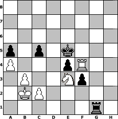 Partie-Notation im PGN-Format [Event "Ferienspass"] [Site "www.mySchach.de"] [Date "2016.07.25"] [Round "1"] [White "espero"] [Black "HenrySchinasky"] [ECO "A45"] [WhitemyELO "1865"] [BlackmyELO "2080"] [Result "0-1"] [TimeControl "10/864000"] [WhiteDays "00"] [BlackDays "10"] [MySchachNr "104308"] 1. d4 Nf6 2. Bg5 Ne4 3. Bf4 c5 4. f3 Nf6 5. d5 d6 6. e4 g6 7. Qd2 Bg7 8. Nc3 O-O 9. Bh6 Nbd7 10. Bxg7 Kxg7 11. g4 Qa5 12. h4 Ne5 13. h5 Kg8 14. Be2 Rb8 15. Qh6 b5 16. Nh3 b4 17. Ng5 bxc3 18. b3 Rd8 19. f4 Nexg4 20. Bxg4 Bxg4 21. hxg6 fxg6 22. Nxh7 Kf7 23. f5 gxf5 24. Nxf6 Qb4 25. a3 Qd4 26. Nxg4 Qxe4+ 27. Ne3 Rh8 28. Qe6+ Qxe6 29. dxe6+ Kxe6 30. Rf1 Rbf8 31. O-O-O Rh3 32. Nd5 Kd7 33. Rh1 Rfh8 34. Rhg1 R8h7 35. Rg8 Rh1 36. Nxc3 Rxd1+ 37. Kxd1 e5 38. Rg6 Rh1+ 39. Kd2 Rh2+ 40. Kc1 Rh1+ 41. Kb2 f4 42. Rf6 a5 43. a4 Rh3 44. Nd5 Rh2 45. Kc1 Rg2 46. Nb6+ Ke7 47. Rh6 f3 48. Nd5+ Kd7 49. Rf6 e4 50. Nc3 Ke7 51. Rf4 Rg1+ 52. Kb2 d5 53. Nxd5+ Kd6 54. Ne3 Ke5 0-1 Stellungs-Notation im FEN-Format 8/8/8/p1p1k3/P3pR2/1P2Np2/1KP5/6r1 - - - 3 55 Geschlagene Figuren Weiss: Geschlagene Figuren Schwarz: Klicken Sie auf eine geschlagene Figur um den gewünschten Zug darzustellen!