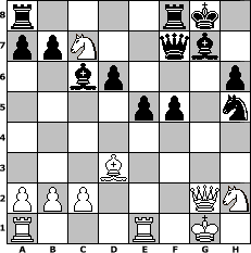 Partie-Notation im PGN-Format [Event "Friends 2"] [Site "www.mySchach.de"] [Date "2007.01.01"] [Round "1"] [White "Knight"] [Black "Papale"] [ECO "A45"] [WhitemyELO "1288"] [BlackmyELO "1816"] [Result "0-1"] [TimeControl "10/864000"] [WhiteDays "08"] [BlackDays "10"] [MySchachNr "31220"] 1. d4 Nf6 2. Nc3 g6 3. e4 d6 4. Nf3 Bg7 5. Bg5 O-O 6. Bd3 Nbd7 7. O-O e5 8. d5 h6 9. Bxf6 Nxf6 10. Re1 Nh5 11. g3 Bg4 12. h3 Bxh3 13. Nh2 Qg5 14. Nf3 Qe7 15. Nh2 Bd7 16. Qd2 f5 17. exf5 gxf5 18. f4 Nxg3 19. Qg2 Nh5 20. fxe5 dxe5 21. d6 cxd6 22. Nd5 Qf7 23. Nc7 Bc6 0-1 Stellungs-Notation im FEN-Format r4rk1/ppN2qb1/2bp3p/4pp1n/8/3B4/PPP3QN/R3R1K1 - - - 4 24 Geschlagene Figuren Weiss: Geschlagene Figuren Schwarz: Klicken Sie auf eine geschlagene Figur um den gewünschten Zug darzustellen!