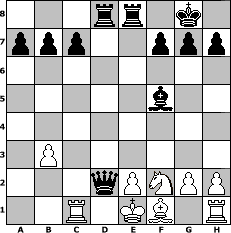 Partie-Notation im PGN-Format [Event "Nu abba los ..."] [Site "www.mySchach.de"] [Date "2005.03.20"] [Round "1"] [White "Hobbykegler"] [Black "Knight"] [ECO "A22"] [WhitemyELO "1114"] [BlackmyELO "1341"] [Result "0-1"] [TimeControl "10/1728000"] [WhiteDays "30"] [BlackDays "59"] [MySchachNr "11329"] 1. c4 e5 2. Nc3 Nf6 3. d3 Bc5 4. Be3 Bxe3 5. fxe3 d5 6. cxd5 Nxd5 7. Nxd5 Qxd5 8. Rc1 Nc6 9. Qc2 O-O 10. d4 exd4 11. exd4 Nxd4 12. Qd1 Rd8 13. Qd3 Bf5 14. Qe3 Re8 15. Qf4 Qa5+ 16. Kd1 Qa4+ 17. b3 Nxb3 18. axb3 Qxf4 19. Nh3 Qd4+ 20. Ke1 Rad8 21. Nf2 Qd2# 0-1 Stellungs-Notation im FEN-Format 3rr1k1/ppp2ppp/8/5b2/8/1P6/3qPNPP/2R1KB1R - - - 6 22 Geschlagene Figuren Weiss: Geschlagene Figuren Schwarz: Klicken Sie auf eine geschlagene Figur um den gewünschten Zug darzustellen!