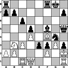 Partie-Notation im PGN-Format [Event "Alapin-Diemer-Gambit Thematurnier"] [Site "www.mySchach.de"] [Date "2010.01.23"] [Round "1"] [White "Seneca"] [Black "espero"] [ECO "C01"] [WhitemyELO "1534"] [BlackmyELO "1740"] [Result "0-1"] [TimeControl "10/2592000"] [WhiteDays "76"] [BlackDays "68"] [MySchachNr "62558"] 1. e4 e6 2. d4 d5 3. Be3 dxe4 4. Nd2 f5 5. Ne2 Nf6 6. Nf4 Bd6 7. Bc4 Qe7 8. O-O O-O 9. c3 g5 10. Nh5 Nd5 11. Bxd5 exd5 12. Nb3 f4 13. Bc1 g4 14. g3 f3 15. Nf4 Qf7 16. Re1 Bf5 17. Be3 c6 18. Qc2 Nd7 19. Rac1 Bxf4 20. Bxf4 Qh5 21. h4 gxh3 22. Kh2 Nf6 23. Rh1 e3 24. Qd1 Ng4+ 0-1 Stellungs-Notation im FEN-Format r4rk1/pp5p/2p5/3p1b1q/3P1Bn1/1NP1ppPp/PP3P1K/2RQ3R - - - 2 25 Geschlagene Figuren Weiss: Geschlagene Figuren Schwarz: Klicken Sie auf eine geschlagene Figur um den gewünschten Zug darzustellen!