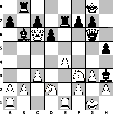 Partie-Notation im PGN-Format [Event " Philidor Ged"] [Site "www.mySchach.de"] [Date "2013.09.07"] [Round "1"] [White "Irina"] [Black "Grubengeist"] [ECO "C22"] [WhitemyELO "1587"] [BlackmyELO "1974"] [Result "0-1"] [TimeControl "10/1728000"] [WhiteDays "20"] [BlackDays "16"] [MySchachNr "90136"] 1. e4 e5 2. d4 exd4 3. Qxd4 Nc6 4. Qe3 Nf6 5. Bc4 Bb4+ 6. c3 Ba5 7. Qe2 O-O 8. Bg5 d6 9. Nd2 Re8 10. Ngf3 Be6 11. Bb5 h6 12. Bxc6 bxc6 13. Bxf6 Qxf6 14. O-O Rab8 15. Qa6 Bb6 16. Qa4 Qg6 17. Rfe1 Bh3 18. g3 h5 19. Qxc6 Re7 0-1 Stellungs-Notation im FEN-Format 1r4k1/p1p1rpp1/1bQp2q1/7p/4P3/2P2NPb/PP1N1P1P/R3R1K1 - - - 1 20 Geschlagene Figuren Weiss: Geschlagene Figuren Schwarz: Klicken Sie auf eine geschlagene Figur um den gewünschten Zug darzustellen!
