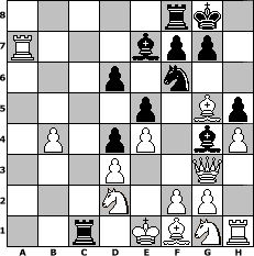 Partie-Notation im PGN-Format [Event "Veni Vidi Vici"] [Site "www.mySchach.de"] [Date "2023.11.13"] [Round "1"] [White "Haneken"] [Black "skuehnel"] [ECO "B20"] [WhitemyELO "1139"] [BlackmyELO "1302"] [Result "0-1"] [TimeControl "10/864000"] [WhiteDays "08"] [BlackDays "08"] [MySchachNr "131037"] 1. e4 c5 2. d3 Nc6 3. Bf4 e5 4. Be3 Nf6 5. Nc3 Qa5 6. Qe2 b5 7. a3 b4 8. Nb1 d6 9. c3 Nd4 10. cxd4 cxd4 11. Bg5 Be7 12. Qf3 Bg4 13. Qg3 bxa3+ 14. Nd2 Qb4 15. bxa3 Rc8 16. axb4 h5 17. h4 O-O 18. Rxa7 Rc1# 0-1 Stellungs-Notation im FEN-Format 5rk1/R3bpp1/3p1n2/4p1Bp/1P1pP1bP/3P2Q1/3N1PP1/2r1KBNR - K - 1 19 Geschlagene Figuren Weiss: ![]() ![]() ![]() ![]() ![]() ![]() ![]() ![]() ![]() ![]() ![]() ![]() ![]() ![]() ![]() Geschlagene Figuren Schwarz: ![]() ![]() ![]() ![]() ![]() ![]() ![]() ![]() ![]() ![]() ![]() ![]() ![]() ![]() ![]() Klicken Sie auf eine geschlagene Figur um den gewünschten Zug darzustellen!
