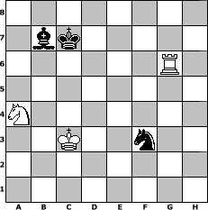 Partie-Notation im PGN-Format [Event "F"] [Site "www.mySchach.de"] [Date "2017.07.01"] [Round "1"] [White "Erich"] [Black "espero"] [Variant "Fischerrandom"] [SetUp "1"] [FEN "brknnbqr/pppppppp/8/8/8/8/PPPPPPPP/BRKNNBQR w KQkq - 0 1"] [WhitemyELO "2135"] [BlackmyELO "1892"] [Result "1/2-1/2"] [TimeControl "10/2592000"] [WhiteDays "150"] [BlackDays "128"] [MySchachNr "108762"] 1. b3 Nc6 2. e4 e5 3. f3 Ba3+ 4. Bb2 Qf8 5. c3 Nf6 6. Nd3 b6 7. Ne3 Bb7 8. Be2 Bxb2+ 9. Nxb2 O-O-O 10. O-O-O d5 11. exd5 Nxd5 12. Nxd5 Rxd5 13. Qe3 f6 14. Bd3 g6 15. Be4 Ra5 16. a4 Rc5 17. Kb1 f5 18. b4 fxe4 19. bxc5 exf3 20. gxf3 Qf7 21. Rhe1 Rd8 22. cxb6 axb6 23. Rc1 Kb8 24. c4 Nd4 25. c5 Nxf3 26. Re2 Rd4 27. Rf2 Qf4 28. Qxf4 exf4 29. d3 Rb4 30. cxb6 Rxb6 31. Rc5 g5 32. a5 Rg6 33. Nc4 g4 34. Rb2 g3 35. hxg3 fxg3 36. Ne3 Ka8 37. Rxc7 Ba6 38. Rb6 Bxd3+ 39. Kb2 Nh4 40. Kc3 Bf1 41. Rxh7 g2 42. Nd5 Rxb6 43. Nxb6+ Kb8 44. Rg7 Nf3 45. a6 Bxa6 46. Rxg2 Kc7 47. Rg6 Bb7 48. Na4 1/2-1/2 Stellungs-Notation im FEN-Format 8/1bk5/6R1/8/N7/2K2n2/8/8 - - - 4 48 Geschlagene Figuren Weiss: Geschlagene Figuren Schwarz: Klicken Sie auf eine geschlagene Figur um den gewünschten Zug darzustellen!