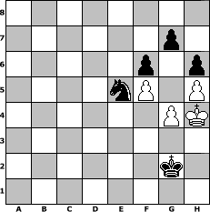 Partie-Notation im PGN-Format [Event "In Memorium Michael Knopf"] [Site "www.mySchach.de"] [Date "2012.04.10"] [Round "1"] [White "Achimkogge"] [Black "Sanji"] [ECO "A46"] [WhitemyELO "1421"] [BlackmyELO "1616"] [Result "0-1"] [TimeControl "10/2592000"] [WhiteDays "223"] [BlackDays "236"] [MySchachNr "81120"] 1. d4 Nf6 2. Nf3 e6 3. c3 c5 4. Bf4 d5 5. e3 Nc6 6. Bb5 Qb6 7. Qb3 Bd7 8. O-O c4 9. Qa4 a6 10. Bxc6 Bxc6 11. Qc2 Be7 12. Ne5 O-O 13. Nxc6 bxc6 14. f3 c5 15. Be5 Nd7 16. Bf4 Bd6 17. Bxd6 Qxd6 18. f4 Rab8 19. Nd2 Rb7 20. Rab1 Rfb8 21. Nf3 cxd4 22. cxd4 f6 23. h4 a5 24. Rf2 Qb4 25. a3 Qb3 26. Qxb3 Rxb3 27. Re2 Rxa3 28. bxa3 Rxb1+ 29. Re1 Rxe1+ 30. Nxe1 a4 31. Kf2 Kf7 32. g4 Nb6 33. Ke2 Ke7 34. h5 Kd6 35. Kd2 e5 36. f5 h6 37. Nf3 exd4 38. exd4 Kc6 39. Kc3 Kb5 40. Nh4 Na8 41. Ng6 Nc7 42. Ne7 Ka5 43. Nc6+ Kb5 44. Nb4 Ka5 45. Kb2 Nb5 46. Nxd5 Nxd4 47. Nb4 Nb5 48. Na2 Kb6 49. Nb4 c3+ 50. Ka2 Kc5 51. Nc2 Kc4 52. Nb4 Nd4 53. Na6 Kd3 54. Nc5+ Ke2 55. Nxa4 c2 56. Nc3+ Kd3 57. Kb2 c1=Q+ 58. Kxc1 Kxc3 59. a4 Kb4 60. a5 Kxa5 61. Kd2 Kb4 62. Kd3 Kc5 63. Ke4 Kc4 64. Ke3 Kd5 65. Kf4 Nc6 66. Ke3 Ke5 67. Kf3 Kd4 68. Kf4 Ne5 69. Kg3 Ke3 70. Kh3 Kf3 71. Kh4 Kg2 0-1 Stellungs-Notation im FEN-Format 8/6p1/5p1p/4nP1P/6PK/8/6k1/8 - - - 22 72 Geschlagene Figuren Weiss: ![]() ![]() ![]() ![]() ![]() ![]() ![]() ![]() ![]() ![]() ![]() ![]() ![]() ![]() ![]() Geschlagene Figuren Schwarz: ![]() ![]() ![]() ![]() ![]() ![]() ![]() ![]() ![]() ![]() ![]() ![]() ![]() ![]() ![]() Klicken Sie auf eine geschlagene Figur um den gewünschten Zug darzustellen!