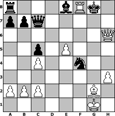 Partie-Notation im PGN-Format [Event "André Chéron - 30. Todestag"] [Site "www.mySchach.de"] [Date "2010.09.12"] [Round "1"] [White "haggard"] [Black "muellerh"] [ECO "A20"] [WhitemyELO "1719"] [BlackmyELO "1507"] [Result "1-0"] [TimeControl "10/1728000"] [WhiteDays "80"] [BlackDays "30"] [MySchachNr "68282"] 1. c4 e5 2. g3 Nf6 3. Bg2 Bc5 4. Nc3 O-O 5. d3 c6 6. e4 d6 7. h3 Ne8 8. Nge2 f5 9. O-O f4 10. gxf4 exf4 11. Bxf4 Nf6 12. Qb3 Kh8 13. d4 Bb6 14. Rad1 Nh5 15. Bh2 Qg5 16. f4 Qg6 17. f5 Qf6 18. Qa3 c5 19. Nd5 Qd8 20. Nxb6 Qxb6 21. dxc5 dxc5 22. Bd6 Nd7 23. Bxf8 Nxf8 24. e5 Bd7 25. Rd6 Qc7 26. Qf3 g6 27. fxg6 hxg6 28. Rxg6 Nxg6 29. Qxh5+ Kg7 30. Rf6 Be8 31. Nf4 Nxf4 32. Qh6+ Kg8 33. Rf8# 1-0 Stellungs-Notation im FEN-Format r3bRk1/ppq5/7Q/2p1P3/2P2n2/7P/PPP3B1/6K1 - - - 3 33 Geschlagene Figuren Weiss: Geschlagene Figuren Schwarz: Klicken Sie auf eine geschlagene Figur um den gewünschten Zug darzustellen!