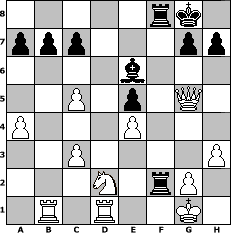 Partie-Notation im PGN-Format [Event "3.)PEPSTEIN - Cup 2009"] [Site "www.mySchach.de"] [Date "2009.04.06"] [Round "1"] [White "reymund"] [Black "BobbyF4"] [ECO "A52"] [WhitemyELO "1583"] [BlackmyELO "1611"] [Result "1-0"] [TimeControl "10/2592000"] [WhiteDays "54"] [BlackDays "53"] [MySchachNr "54639"] 1. d4 Nf6 2. c4 e5 3. dxe5 Ng4 4. Bf4 Nc6 5. Nf3 Bb4+ 6. Nc3 Bxc3+ 7. bxc3 Qe7 8. Qd5 f6 9. exf6 Nxf6 10. Qd3 d6 11. e4 O-O 12. Nd2 Ne5 13. Bxe5 dxe5 14. Be2 Be6 15. O-O Rad8 16. Qe3 Ng4 17. Bxg4 Bxg4 18. h3 Be6 19. c5 Rf4 20. a4 Qg5 21. Rfd1 Rdf8 22. Rab1 Rxf2 23. Qxg5 1-0 Stellungs-Notation im FEN-Format 5rk1/ppp3pp/4b3/2P1p1Q1/P3P3/2P4P/3N1rP1/1R1R2K1 - - - 0 23 Geschlagene Figuren Weiss: Geschlagene Figuren Schwarz: Klicken Sie auf eine geschlagene Figur um den gewünschten Zug darzustellen!