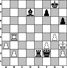 Partie-Notation im PGN-Format [Event "CAISSA.COM IS DEAD TO ME!"] [Site "www.mySchach.de"] [Date "2020.03.28"] [Round "1"] [White "borsti"] [Black "alibengali"] [ECO "A45"] [WhitemyELO "1244"] [BlackmyELO "1669"] [Result "0-1"] [TimeControl "10/2592000"] [WhiteDays "29"] [BlackDays "28"] [MySchachNr "117696"] 1. d4 Nf6 2. Bg5 d5 3. e3 c5 4. dxc5 e5 5. Bb5+ Nc6 6. Nc3 Bxc5 7. Nge2 Be6 8. O-O d4 9. exd4 exd4 10. Ne4 Bb6 11. Bxc6+ bxc6 12. Qd3 h6 13. Nxf6+ gxf6 14. Bh4 c5 15. Rfe1 c4 16. Qe4 O-O 17. Rad1 f5 18. Bxd8 fxe4 19. Bxb6 axb6 20. a3 d3 21. cxd3 exd3 22. Nc3 Rfe8 23. Nb5 Bd7 24. Nc7 Rxe1+ 25. Rxe1 Rc8 26. Nd5 Rd8 27. Nxb6 d2 28. Rd1 Re8 29. Kf1 Bb5 30. g3 c3+ 31. Kg2 c2 32. Rxd2 c1=Q 33. Rd4 Qc6+ 34. f3 Qxb6 35. Rb4 Re2+ 36. Kh3 Bd7+ 37. g4 Qf2 0-1 Stellungs-Notation im FEN-Format 6k1/3b1p2/7p/8/1R4P1/P4P1K/1P2rq1P/8 - - - 1 38 Geschlagene Figuren Weiss: Geschlagene Figuren Schwarz: Klicken Sie auf eine geschlagene Figur um den gewünschten Zug darzustellen!