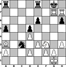 Partie-Notation im PGN-Format [Event "Sommerturnier 2012"] [Site "www.mySchach.de"] [Date "2012.06.21"] [Round "1"] [White "Naunhofer"] [Black "bawcer"] [ECO "A50"] [WhitemyELO "1650"] [BlackmyELO "1470"] [Result "1-0"] [TimeControl "10/1728000"] [WhiteDays "20"] [BlackDays "18"] [MySchachNr "82406"] 1. d4 Nf6 2. c4 d5 3. Nc3 h6 4. Nf3 Bf5 5. e3 e6 6. Be2 Bb4 7. O-O Bxc3 8. bxc3 O-O 9. Ba3 Re8 10. c5 Nc6 11. h3 a6 12. Bd3 b5 13. cxb6 cxb6 14. Qc2 Bxd3 15. Qxd3 a5 16. Rab1 Qc8 17. Rxb6 Rb8 18. Rfb1 Qc7 19. Qa6 Ra8 20. Rxc6 Rxa6 21. Rxc7 Ne4 22. Rbb7 Raa8 23. Rxf7 Nxc3 24. Rxg7+ Kh8 25. Rh7+ Kg8 26. Rbg7# 1-0 Stellungs-Notation im FEN-Format r3r1k1/6RR/4p2p/p2p4/3P4/B1n1PN1P/P2P1PP1/6K1 - - - 4 26 Geschlagene Figuren Weiss: Geschlagene Figuren Schwarz: Klicken Sie auf eine geschlagene Figur um den gewünschten Zug darzustellen!