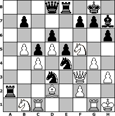 Partie-Notation im PGN-Format [Event "Die Weinlese 2017"] [Site "www.mySchach.de"] [Date "2017.09.05"] [Round "1"] [White "deepsabel"] [Black "Erich"] [ECO "E21"] [WhitemyELO "1894"] [BlackmyELO "2161"] [Result "0-1"] [TimeControl "10/1728000"] [WhiteDays "80"] [BlackDays "80"] [MySchachNr "109474"] 1. d4 Nf6 2. c4 e6 3. Nc3 Bb4 4. Nf3 h6 5. e3 O-O 6. Bd3 d6 7. O-O c6 8. e4 e5 9. Re1 Bg4 10. a3 Ba5 11. Be3 Nbd7 12. h3 Bh5 13. b4 Bb6 14. d5 a5 15. Qe2 Bd4 16. Rac1 axb4 17. axb4 Re8 18. Bd2 Ra3 19. Nb1 Ra8 20. Bc3 Qb6 21. g4 Bg6 22. Qb2 c5 23. b5 Qd8 24. Qe2 Nf8 25. Kh1 Bh7 26. Rg1 Ng6 27. Bd2 Ra2 28. Nxd4 Nf4 29. Qf3 Nxd3 30. Nf5 Nxe4 0-1 Stellungs-Notation im FEN-Format 3qr1k1/1p3ppb/3p3p/1PpPpN2/2P1n1P1/3n1Q1P/r2B1P2/1NR3RK - - - 0 31 Geschlagene Figuren Weiss: Geschlagene Figuren Schwarz: Klicken Sie auf eine geschlagene Figur um den gewünschten Zug darzustellen!