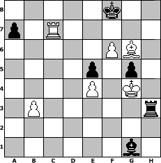 Partie-Notation im PGN-Format [Event "Dabei ist alles 6"] [Site "www.mySchach.de"] [Date "2009.03.21"] [Round "1"] [White "Andylein1989"] [Black "brucybabe"] [ECO "B32"] [WhitemyELO "1606"] [BlackmyELO "1620"] [Result "1-0"] [TimeControl "10/864000"] [WhiteDays "10"] [BlackDays "10"] [MySchachNr "54096"] 1. e4 c5 2. Nf3 Nc6 3. d4 cxd4 4. Nxd4 d6 5. Nc3 Nf6 6. Bg5 e5 7. Nxc6 bxc6 8. Be2 Be7 9. h3 O-O 10. O-O Be6 11. Qd2 Qc7 12. Rad1 Rfd8 13. f4 h6 14. Bxf6 Bxf6 15. f5 Bc8 16. Bh5 Bb7 17. Bf3 Rd7 18. Na4 Rad8 19. b3 d5 20. Qf2 d4 21. Nc5 Rd6 22. c3 dxc3 23. Rxd6 Rxd6 24. Qe3 Qb6 25. Qxc3 Rd4 26. Kh2 Ba6 27. Nxa6 Qxa6 28. Rf2 Qb6 29. Rc2 Rd6 30. Qc5 Qxc5 31. Rxc5 Bg5 32. Kg3 Bf4+ 33. Kf2 Rd2+ 34. Be2 Rxa2 35. Kf3 Bh2 36. Rxc6 Rd2 37. Rc7 Bg1 38. Bc4 Rf2+ 39. Kg4 Rxg2+ 40. Kf3 Rf2+ 41. Kg3 h5 42. Bxf7+ Kh7 43. Rc1 h4+ 44. Kxh4 Rg2 45. Rc8 g5+ 46. Kh5 Rg3 47. Bg6+ Kg7 48. Rc7+ Kf8 49. f6 Rxh3+ 50. Kg4 1-0 Stellungs-Notation im FEN-Format 5k2/p1R5/5PB1/4p1p1/4P1K1/1P5r/8/6b1 - - - 1 50 Geschlagene Figuren Weiss: Geschlagene Figuren Schwarz: Klicken Sie auf eine geschlagene Figur um den gewünschten Zug darzustellen!