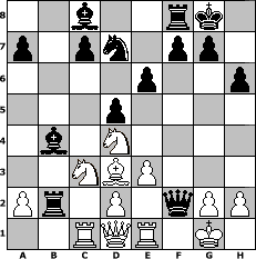 Partie-Notation im PGN-Format [Event "Jahreswechsel 2016/17"] [Site "www.mySchach.de"] [Date "2016.12.03"] [Round "1"] [White "Knight"] [Black "MiLi"] [ECO "?"] [WhitemyELO "1256"] [BlackmyELO "1501"] [Result "0-1"] [TimeControl "10/3456000"] [WhiteDays "40"] [BlackDays "38"] [MySchachNr "105929"] 1. d4 Nf6 2. c4 e6 3. Nc3 d5 4. c5 b6 5. Bg5 bxc5 6. dxc5 Bxc5 7. e3 h6 8. Bh4 O-O 9. Nf3 Nbd7 10. Bd3 Rb8 11. O-O Rxb2 12. Bxf6 Qxf6 13. Rc1 Bd6 14. Re1 Bb4 15. Nd4 Qxf2+ 0-1 Stellungs-Notation im FEN-Format 2b2rk1/p1pn1pp1/4p2p/3p4/1b1N4/2NBP3/Pr1P1qPP/2RQR1K1 - - - 0 16 Geschlagene Figuren Weiss: ![]() ![]() ![]() ![]() ![]() ![]() ![]() ![]() ![]() ![]() ![]() ![]() ![]() ![]() ![]() Geschlagene Figuren Schwarz: ![]() ![]() ![]() ![]() ![]() ![]() ![]() ![]() ![]() ![]() ![]() ![]() ![]() ![]() ![]() Klicken Sie auf eine geschlagene Figur um den gewünschten Zug darzustellen!