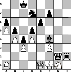 Partie-Notation im PGN-Format [Event "Sommerschach"] [Site "www.mySchach.de"] [Date "2018.05.26"] [Round "1"] [White "lotchi"] [Black "Schefsche"] [ECO "A04"] [WhitemyELO "1068"] [BlackmyELO "1330"] [Result "0-1"] [TimeControl "10/2592000"] [WhiteDays "28"] [BlackDays "30"] [MySchachNr "112238"] 1. Nf3 d6 2. d4 Bg4 3. Nc3 Bxf3 4. exf3 a6 5. Be3 Nf6 6. Bc4 b5 7. Bd3 h6 8. O-O Nbd7 9. a3 c5 10. b4 c4 11. Bf5 e6 12. Bh3 g5 13. f4 gxf4 14. Bxf4 d5 15. f3 Nh5 16. g3 Nxf4 17. gxf4 Qh4 18. Bg2 Bd6 19. Ne2 O-O-O 20. Qe1 Qf6 21. c3 Rdg8 22. Qd2 h5 23. a4 h4 24. Rf2 h3 25. a5 Qh4 26. Kf1 Rxg2 27. Rxg2 hxg2+ 28. Kxg2 Qxh2+ 29. Kf1 Qh1+ 30. Ng1 Rh2 31. Qe3 Qg2+ 32. Ke1 Qg3+ 33. Kf1 Bxf4 34. Qe1 Qg2# 0-1 Stellungs-Notation im FEN-Format 2k5/3n1p2/p3p3/Pp1p4/1PpP1b2/2P2P2/6qr/R3QKN1 - - - 2 35 Geschlagene Figuren Weiss: Geschlagene Figuren Schwarz: Klicken Sie auf eine geschlagene Figur um den gewünschten Zug darzustellen!