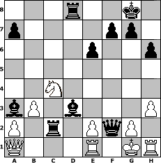 Partie-Notation im PGN-Format [Event "Winteranfang 2017"] [Site "www.mySchach.de"] [Date "2017.12.21"] [Round "1"] [White "Joschi"] [Black "lisama"] [ECO "B41"] [WhitemyELO "1554"] [BlackmyELO "1653"] [Result "0-1"] [TimeControl "10/3456000"] [WhiteDays "40"] [BlackDays "34"] [MySchachNr "110795"] 1. e4 c5 2. Nf3 e6 3. d4 cxd4 4. Nxd4 Nf6 5. Bd3 Nc6 6. Be3 d5 7. exd5 Nxd5 8. Nxc6 bxc6 9. Bd2 Rb8 10. b3 Qf6 11. c3 Bd6 12. Qc2 Qe5+ 13. Kf1 Qf6 14. Be4 Ba6+ 15. Kg1 h6 16. Bxd5 cxd5 17. Be3 O-O 18. Nd2 Rfc8 19. Rc1 Ba3 20. Re1 Rxc3 21. Qb1 Bd3 22. Qa1 d4 23. Bxd4 Qxd4 24. Nf3 Qc5 25. h3 Rd8 26. Nd2 Rc2 27. Nc4 Qxf2+ 0-1 Stellungs-Notation im FEN-Format 3r2k1/p4pp1/4p2p/8/2N5/bP1b3P/P1r1PqP1/Q3R1KR - - - 0 28 Geschlagene Figuren Weiss: Geschlagene Figuren Schwarz: Klicken Sie auf eine geschlagene Figur um den gewünschten Zug darzustellen!