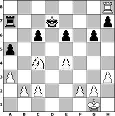 Partie-Notation im PGN-Format [Event "Wrixum - Open die XII"] [Site "www.mySchach.de"] [Date "2014.10.09"] [Round "1"] [White "Helmut48"] [Black "Naunhofer"] [ECO "B30"] [WhitemyELO "1973"] [BlackmyELO "1594"] [Result "1-0"] [TimeControl "10/2592000"] [WhiteDays "116"] [BlackDays "114"] [MySchachNr "96310"] 1. e4 c5 2. Nf3 Nc6 3. Nc3 d6 4. d4 cxd4 5. Nxd4 a6 6. Nxc6 bxc6 7. Bc4 e5 8. Qh5 g6 9. Qe2 Be6 10. O-O a5 11. Rd1 Qc7 12. h3 Nf6 13. Be3 Bg7 14. a3 O-O 15. Bxe6 fxe6 16. Qc4 Qd7 17. Bc5 d5 18. Bxf8 dxc4 19. Rxd7 Nxd7 20. Bd6 Bf8 21. Rd1 Ra7 22. Bxf8 Nxf8 23. Rd6 Rb7 24. Na4 Rc7 25. Nb6 Kf7 26. Nxc4 Ke7 27. Rd3 Rb7 28. Rb3 Ra7 29. Nxe5 Kd6 30. Nc4+ Kc7 31. Rf3 Kd8 32. Rxf8+ Ke7 33. Rc8 Kd7 34. Rh8 1-0 Stellungs-Notation im FEN-Format 7R/r2k3p/2p1p1p1/p7/2N1P3/P6P/1PP2PP1/6K1 - - - 4 34 Geschlagene Figuren Weiss: Geschlagene Figuren Schwarz: Klicken Sie auf eine geschlagene Figur um den gewünschten Zug darzustellen!