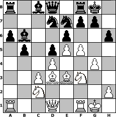 Partie-Notation im PGN-Format [Event "Carpe Diem 2"] [Site "www.mySchach.de"] [Date "2007.08.11"] [Round "1"] [White "ujack1961"] [Black "MichaelKnopf"] [ECO "B01"] [WhitemyELO "1781"] [BlackmyELO "1438"] [Result "1-0"] [TimeControl "10/1728000"] [WhiteDays "40"] [BlackDays "29"] [MySchachNr "37233"] 1. e4 d5 2. e5 e6 3. f4 Ne7 4. Nf3 Nf5 5. Be2 Be7 6. O-O O-O 7. d4 Bb4 8. c3 Ba5 9. b4 Bb6 10. a4 a6 11. Na3 c6 12. g4 Ne7 13. a5 Bc7 14. Bd3 b6 15. axb6 Bxb6 16. Be3 Nd7 17. Nc2 h6 18. b5 cxb5 19. f5 1-0 Stellungs-Notation im FEN-Format r1bq1rk1/3nnpp1/pb2p2p/1p1pPP2/3P2P1/2PBBN2/2N4P/R2Q1RK1 - - - 0 19 Geschlagene Figuren Weiss: ![]() ![]() ![]() ![]() ![]() ![]() ![]() ![]() ![]() ![]() ![]() ![]() ![]() ![]() ![]() Geschlagene Figuren Schwarz: ![]() ![]() ![]() ![]() ![]() ![]() ![]() ![]() ![]() ![]() ![]() ![]() ![]() ![]() ![]() Klicken Sie auf eine geschlagene Figur um den gewünschten Zug darzustellen!