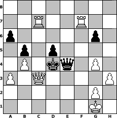 Partie-Notation im PGN-Format [Event "Albspiele 9"] [Site "www.mySchach.de"] [Date "2010.12.30"] [Round "1"] [White "Winston"] [Black "Achimkogge"] [ECO "C41"] [WhitemyELO "1458"] [BlackmyELO "1354"] [Result "1-0"] [TimeControl "10/1728000"] [WhiteDays "116"] [BlackDays "115"] [MySchachNr "70846"] 1. e4 e5 2. Nf3 d6 3. h3 a6 4. d4 Be7 5. c3 exd4 6. cxd4 Nf6 7. Nc3 Nc6 8. a3 b5 9. b4 Bb7 10. Bd3 O-O 11. O-O Nd7 12. Bb2 Bf6 13. Nd5 Ne7 14. Nxf6+ Nxf6 15. Qc2 Ng6 16. Rad1 Nf4 17. Rfe1 Nxd3 18. Rxd3 Nxe4 19. Re3 Re8 20. Qd1 Qf6 21. R1e2 Bd5 22. Qe1 Qf4 23. Bc1 Qf5 24. Nh2 h6 25. f3 Nf6 26. Ng4 Be6 27. Qg3 Kf8 28. Re1 h5 29. Nxf6 Qxf6 30. Bb2 h4 31. Qf2 d5 32. Qc2 Rac8 33. Re5 g6 34. Bc1 Qg7 35. Qc5+ Re7 36. Bg5 f6 37. Rxe6 fxg5 38. Rxe7 Qf6 39. Rxc7+ Kg8 40. Rxc8+ Kg7 41. Re7+ Kh6 42. Rcc7 g4 43. Rh7+ Kg5 44. fxg4 Qe6 45. Qc1+ Kf6 46. Qf1+ Kg5 47. Qf2 Qe4 48. Qxh4+ Kf4 49. Rhf7+ Ke3 50. Qe1+ Kxd4 51. Qc3# 1-0 Stellungs-Notation im FEN-Format 8/2R2R2/p5p1/1p1p4/1P1kq1P1/P1Q4P/6P1/6K1 - - - 1 51 Geschlagene Figuren Weiss: Geschlagene Figuren Schwarz: Klicken Sie auf eine geschlagene Figur um den gewünschten Zug darzustellen!