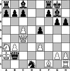 Partie-Notation im PGN-Format [Event "Tigran (Wartanowitsch)Petrosjan Turnier"] [Site "www.mySchach.de"] [Date "2009.08.09"] [Round "1"] [White "Hobbykegler"] [Black "HenrySchinasky"] [ECO "A15"] [WhitemyELO "1093"] [BlackmyELO "2111"] [Result "0-1"] [TimeControl "10/2592000"] [WhiteDays "56"] [BlackDays "58"] [MySchachNr "58150"] 1. c4 Nf6 2. b3 g6 3. Bb2 Bg7 4. Qc2 O-O 5. Nf3 Nc6 6. Na3 d5 7. c5 d4 8. Ng5 e5 9. O-O-O h6 10. Ne4 Nb4 11. Qc4 Nxa2+ 12. Kb1 Nxe4 13. Kxa2 Nxf2 14. e3 Nxd1 15. Ba1 dxe3 16. dxe3 Qd2+ 17. Bb2 Qxb2# 0-1 Stellungs-Notation im FEN-Format r1b2rk1/ppp2pb1/6pp/2P1p3/2Q5/NP2P3/Kq4PP/3n1B1R - - - 0 18 Geschlagene Figuren Weiss: Geschlagene Figuren Schwarz: Klicken Sie auf eine geschlagene Figur um den gewünschten Zug darzustellen!