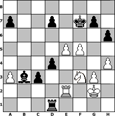 Partie-Notation im PGN-Format [Event "Relax 2009"] [Site "www.mySchach.de"] [Date "2009.05.20"] [Round "1"] [White "martinus"] [Black "gambito"] [ECO "C21"] [WhitemyELO "1890"] [BlackmyELO "1500"] [Result "0-1"] [TimeControl "10/3456000"] [WhiteDays "141"] [BlackDays "030"] [MySchachNr "55841"] 1. e4 e5 2. d4 exd4 3. c3 dxc3 4. Nxc3 Nc6 5. Bc4 Nf6 6. Qb3 Qe7 7. Nf3 Na5 8. Qb5 Nxc4 9. Qxc4 Qe6 10. Qxe6+ fxe6 11. O-O c6 12. a3 b6 13. Bf4 Bc5 14. b4 Be7 15. Rfd1 Bb7 16. Rac1 Rc8 17. e5 Nd5 18. Nxd5 exd5 19. Bg5 Bxg5 20. Nxg5 O-O 21. Rc3 c5 22. bxc5 h6 23. Nf3 bxc5 24. Rdc1 c4 25. Nd4 Bc6 26. g3 Rb8 27. f4 Ba4 28. Rf1 Rb2 29. h4 Kf7 30. Rf2 Rfb8 31. f5 Rb1+ 32. Kg2 Rd1 33. Nf3 Rb3 34. Rxb3 Bxb3 35. Rb2 d4 36. Re2 c3 0-1 Stellungs-Notation im FEN-Format 8/p2p1kp1/7p/4PP2/3p3P/Pbp2NP1/4R1K1/3r4 - - - 0 37 Geschlagene Figuren Weiss: Geschlagene Figuren Schwarz: Klicken Sie auf eine geschlagene Figur um den gewünschten Zug darzustellen!