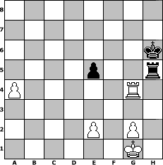 Partie-Notation im PGN-Format [Event "Sommer-ade,scheiden tut weh."] [Site "www.mySchach.de"] [Date "2013.09.18"] [Round "1"] [White "Winston"] [Black "Knight"] [ECO "C44"] [WhitemyELO "1512"] [BlackmyELO "1290"] [Result "1-0"] [TimeControl "10/1728000"] [WhiteDays "20"] [BlackDays "20"] [MySchachNr "90298"] 1. e4 e5 2. Nf3 Nc6 3. a3 Nf6 4. Bb5 Bc5 5. O-O O-O 6. h3 d6 7. Nc3 Re8 8. d3 Bd7 9. Bg5 a6 10. Ba4 b5 11. Bb3 Nd4 12. Nxd4 Bxd4 13. Rb1 a5 14. Bxf6 Qxf6 15. Nd5 Qd8 16. Qf3 Be6 17. Qg3 a4 18. Ba2 c6 19. c3 Bc5 20. d4 exd4 21. cxd4 Bxd4 22. Nb4 Bxa2 23. Nxa2 c5 24. b3 c4 25. bxc4 bxc4 26. Rbd1 Qf6 27. Nb4 Bc3 28. Nd5 Qe5 29. Nc7 Qxg3 30. fxg3 Be5 31. Kh2 Rec8 32. Nxa8 Rxa8 33. Rd5 c3 34. Rc1 h6 35. h4 Rc8 36. Ra5 Rc4 37. Rxe5 dxe5 38. Kh3 Rxe4 39. Rxc3 g5 40. hxg5 hxg5 41. Rd3 f5 42. Kh2 f4 43. gxf4 Rxf4 44. Rg3 Rh4+ 45. Kg1 Rh5 46. Rg4 Kh7 47. Rxa4 g4 48. Rxg4 Kh6 49. a4 1-0 Stellungs-Notation im FEN-Format 8/8/7k/4p2r/P5R1/8/4P1P1/6K1 - - - 0 49 Geschlagene Figuren Weiss: Geschlagene Figuren Schwarz: Klicken Sie auf eine geschlagene Figur um den gewünschten Zug darzustellen!