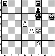 game notation in PGN-format [Event "Mit Dame Gambit ins Fr"] [Site "www.myChess.de"] [Date "2006.01.31"] [Round "1"] [White "rikilatic"] [Black "hermtz"] [ECO "D20"] [WhitemyELO "1506"] [BlackmyELO "1650"] [Result "0-1"] [TimeControl "10/864000"] [WhiteDays "10"] [BlackDays "10"] [MyChessNo "22088"] 1. d4 d5 2. c4 dxc4 3. Qa4+ Nc6 4. e3 e6 5. Bxc4 Nf6 6. Nf3 Bd6 7. Nc3 O-O 8. a3 a6 9. Qc2 e5 10. d5 Na5 11. Bd3 Bg4 12. Ng5 h6 13. Nf3 b5 14. h3 Bxf3 15. gxf3 Nh5 16. Rg1 Qh4 17. Bf5 Qc4 18. Bd3 Qb3 19. Qd2 Nc4 20. Bxc4 Qxc4 21. e4 Nf4 22. Qc2 a5 23. Bxf4 exf4 24. O-O-O b4 25. Qe2 Qb3 26. Nb5 bxa3 27. Nxd6 a2 28. Kd2 Qxb2+ 29. Ke1 a1=Q 30. Qxb2 Qxb2 31. Nf5 Qc3+ 32. Kf1 Qxf3 33. Nxh6+ Kh7 34. Rc1 Qxh3+ 35. Ke2 gxh6 36. Rxc7 a4 37. Rcc1 a3 38. Rh1 f3+ 39. Ke3 Qd7 40. Rh4 a2 41. Rch1 Qd6 42. Rxh6+ Qxh6+ 43. Rxh6+ Kxh6 44. Kxf3 a1=Q 45. Kf4 Qf6+ 0-1 position notation in FEN-format r4r2/5p2/5q1k/3P4/4PK2/8/5P2/8 - - - 2 46 Captured white pieces: ![]() ![]() ![]() ![]() ![]() ![]() ![]() ![]() ![]() ![]() ![]() ![]() ![]() ![]() ![]() Captured black pieces: ![]() ![]() ![]() ![]() ![]() ![]() ![]() ![]() ![]() ![]() ![]() ![]() ![]() ![]() ![]() Click on a captured piece in order to display the desired move!