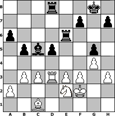 game notation in PGN-format [Event "Wanderpokal November 2006"] [Site "www.myChess.de"] [Date "2006.11.11"] [Round "1"] [White "hermtz"] [Black "WalterKelsch7"] [ECO "D04"] [WhitemyELO "1746"] [BlackmyELO "1815"] [Result "1/2-1/2"] [TimeControl "10/864000"] [WhiteDays "10"] [BlackDays "10"] [MyChessNo "29984"] 1. d4 d5 2. Nf3 Nf6 3. e3 Bg4 4. Bd3 Nc6 5. Nbd2 e5 6. dxe5 Nxe5 7. Be2 Nxf3+ 8. Nxf3 Bd6 9. h3 Bf5 10. O-O O-O 11. b3 Ne4 12. Bb2 Bb4 13. Qd4 Qf6 14. Qxf6 Nxf6 15. c3 Be7 16. Nd4 Be4 17. Rfd1 Rad8 18. f3 Bg6 19. Kf2 c5 20. Nb5 a6 21. Na3 b5 22. Rac1 Rfe8 23. Bd3 Bxd3 24. Rxd3 c4 25. Rd2 Nd7 26. Nc2 Ne5 27. Ne1 Bc5 28. Rcd1 Nd3+ 29. Rxd3 cxd3 30. Rxd3 Re6 31. Nc2 Rde8 32. Bc1 Rd8 33. Nd4 Ree8 34. Ne2 g5 35. g4 Re6 1/2-1/2 position notation in FEN-format 3r2k1/5p1p/p3r3/1pbp2p1/6P1/1PPRPP1P/P3NK2/2B5 - - - 1 36 Captured white pieces: Captured black pieces: Click on a captured piece in order to display the desired move!