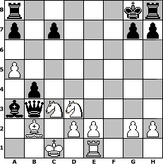 game notation in PGN-format [Event "Auf Die WM!!!!!!!!!!!! (2010 werden wir Meister)"] [Site "www.myChess.de"] [Date "2006.07.21"] [Round "1"] [White "crca108"] [Black "Vouivre"] [ECO "C24"] [WhitemyELO "1409"] [BlackmyELO "1549"] [Result "0-1"] [TimeControl "10/2592000"] [WhiteDays "89"] [BlackDays "81"] [MyChessNo "27073"] 1. e4 e5 2. Bc4 Nf6 3. Qf3 Nc6 4. a3 Nd4 5. Qc3 Nxe4 6. Bxf7+ Kxf7 7. Qc4+ d5 8. Qd3 Bf5 9. Nh3 Nxf2 10. Nxf2 Bxd3 11. Nxd3 Nxc2+ 12. Kd1 Nxa1 13. Nxe5+ Kg8 14. b4 Nb3 15. Bb2 Qf6 16. Kc2 d4 17. Nf3 Na5 18. bxa5 d3+ 19. Kc1 Qc6+ 20. Nc3 b6 21. Nd4 Qc4 22. Nf3 b5 23. Ne5 Qb3 24. Nxd3 Bxa3 25. Re1 b4 0-1 position notation in FEN-format r5kr/p1p3pp/8/P7/1p6/bqNN4/1B1PP1PP/2K1R3 - - - 0 26 Captured white pieces: Captured black pieces: Click on a captured piece in order to display the desired move!