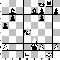 | game notation in PGN-format [Event "Sommersonnenwende"] [Site "www.myChess.de"] [Date "2007.06.15"] [Round "1"] [White "nogumo"] [Black "HenrySchinasky"] [ECO "A00"] [WhitemyELO "1676"] [BlackmyELO "1867"] [Result "0-1"] [TimeControl "10/1728000"] [WhiteDays "56"] [BlackDays "60"] [MyChessNo "35717"] 1. b4 d5 2. Bb2 Nd7 3. e3 e5 4. b5 Ngf6 5. Nf3 e4 6. Nd4 Ne5 7. Be2 a6 8. bxa6 bxa6 9. c4 Rb8 10. Bc3 dxc4 11. Bxc4 Nxc4 12. Nc6 Rxb1 13. Rxb1 Qd5 14. Qa4 Nb6 15. Rxb6 cxb6 16. Nb4+ Qd7 17. Qc2 Bb7 18. O-O a5 19. Bxf6 gxf6 20. Na6 Bxa6 21. Qxe4+ Be7 22. Rc1 Bb7 23. Qf4 Qxd2 24. Qa4+ Kf8 25. Rd1 Qe2 26. Qd4 Rg8 0-1 position notation in FEN-format 5kr1/1b2bp1p/1p3p2/p7/3Q4/4P3/P3qPPP/3R2K1 - - - 6 27 Captured white pieces:                              Captured black pieces:                               Click on a captured piece in order to display the desired move!