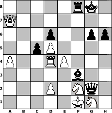 game notation in PGN-format [Event "In Memorium Michael Knopf 4"] [Site "www.myChess.de"] [Date "2015.04.10"] [Round "1"] [White "sprinterde"] [Black "espero"] [ECO "A65"] [WhitemyELO "1746"] [BlackmyELO "1944"] [Result "0-1"] [TimeControl "10/2592000"] [WhiteDays "118"] [BlackDays "101"] [MyChessNo "98915"] 1. d4 Nf6 2. c4 c5 3. d5 e6 4. Nc3 exd5 5. cxd5 d6 6. e4 g6 7. Bg5 h6 8. Bxf6 Qxf6 9. Bb5+ Nd7 10. Qb3 Bg7 11. Bxd7+ Bxd7 12. Qxb7 Qd8 13. Nge2 O-O 14. O-O Rb8 15. Qxa7 Rxb2 16. Rab1 Rc2 17. Rfc1 Rxc1+ 18. Rxc1 f5 19. Rb1 Bc8 20. a4 Qh4 21. g3 Qf6 22. Re1 f4 23. gxf4 Qh4 24. Nd1 Qg4+ 25. Kf1 Qf3 26. Ng1 Qxf4 27. Re3 Bg4 28. f3 Bd4 29. Rd3 Qxh2 30. Rxd4 Bxf3 31. Nf2 Qg2+ 0-1 position notation in FEN-format 5rk1/Q7/3p2pp/2pP4/P2RP3/5b2/3P1Nq1/5KN1 - - - 2 32 Captured white pieces: ![]() ![]() ![]() ![]() ![]() ![]() ![]() ![]() ![]() ![]() ![]() ![]() ![]() ![]() ![]() Captured black pieces: ![]() ![]() ![]() ![]() ![]() ![]() ![]() ![]() ![]() ![]() ![]() ![]() ![]() ![]() ![]() Click on a captured piece in order to display the desired move!