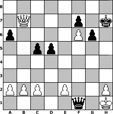game notation in PGN-format [Event "2011 geht es rund!"] [Site "www.myChess.de"] [Date "2010.12.20"] [Round "1"] [White "squeezer"] [Black "Naunhofer"] [ECO "B23"] [WhitemyELO "1545"] [BlackmyELO "1672"] [Result "0-1"] [TimeControl "10/864000"] [WhiteDays "31"] [BlackDays "36"] [MyChessNo "70652"] 1. e4 c5 2. Nc3 e6 3. f4 Nc6 4. Nf3 a6 5. d4 cxd4 6. Nxd4 Bb4 7. Nxc6 bxc6 8. Bd2 Nf6 9. e5 Nd5 10. Nxd5 Bxd2+ 11. Qxd2 exd5 12. Bd3 d6 13. exd6 Qxd6 14. O-O O-O 15. f5 Bb7 16. f6 Rfe8 17. Qg5 g6 18. Qh6 Qf8 19. Qh4 Re5 20. g4 Rae8 21. Rf3 c5 22. Rh3 h5 23. gxh5 Rxh5 24. Qg3 Qh6 25. Rxh5 Qxh5 26. Rf1 Re5 27. Bf5 Rxf5 28. Qb8+ Kh7 29. Rxf5 Qg4+ 30. Kh1 Qxf5 31. Qxb7 Qf1# 0-1 position notation in FEN-format 8/1Q3p1k/p4Pp1/2pp4/8/8/PPP1P2P/5q1K - - - 1 32 Captured white pieces: Captured black pieces: Click on a captured piece in order to display the desired move!