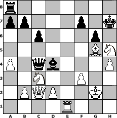 game notation in PGN-format [Event "Bobby Fischer Ged"] [Site "www.myChess.de"] [Date "2008.02.01"] [Round "1"] [White "deepsabel"] [Black "brucybabe"] [ECO "D80"] [WhitemyELO "1779"] [BlackmyELO "1607"] [Result "1-0"] [TimeControl "10/864000"] [WhiteDays "30"] [BlackDays "30"] [MyChessNo "42168"] 1. d4 Nf6 2. c4 g6 3. Nc3 d5 4. h4 h5 5. Bg5 dxc4 6. e4 Bg7 7. Bxc4 O-O 8. Nge2 c6 9. a4 Nbd7 10. O-O Qc7 11. e5 Nxe5 12. dxe5 Ng4 13. Ng3 Nxe5 14. Bb3 Bg4 15. Qc2 Qc8 16. Bxe7 Re8 17. Bg5 Kh7 18. f3 Be6 19. Bxe6 Qxe6 20. Rae1 Nxf3+ 21. gxf3 Bd4+ 22. Kg2 Qc4 23. Nxh5 Rxe1 24. Rxe1 1-0 position notation in FEN-format r7/pp3p1k/2p3p1/6BN/P1qb3P/2N2P2/1PQP2K1/4R3 - - - 0 24 Captured white pieces: Captured black pieces: Click on a captured piece in order to display the desired move!