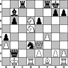 | game notation in PGN-format [Event "Sommersonnenwende"] [Site "www.myChess.de"] [Date "2007.06.15"] [Round "1"] [White "lure"] [Black "HenrySchinasky"] [ECO "B02"] [WhitemyELO "1449"] [BlackmyELO "1867"] [Result "0-1"] [TimeControl "10/1728000"] [WhiteDays "60"] [BlackDays "60"] [MyChessNo "35728"] 1. e4 Nf6 2. e5 Nd5 3. c4 Nb6 4. d4 d6 5. Nf3 dxe5 6. c5 N6d7 7. dxe5 e6 8. Be3 Bxc5 9. Qb3 a5 10. Bxc5 Nxc5 11. Qe3 Qe7 12. Nc3 O-O 13. O-O-O b6 14. Nd4 a4 15. a3 Bb7 16. f4 Nc6 17. Ndb5 f6 18. exf6 Qxf6 19. Nxc7 Rac8 20. N7b5 Ne7 21. Nd6 Nd5 22. Nxd5 Nd3+ 23. Kb1 Qxb2# 0-1 position notation in FEN-format 2r2rk1/1b4pp/1p1Np3/3N4/p4P2/P2nQ3/1q2P1PP/1K1R1B1R - - - 0 24 Captured white pieces:                              Captured black pieces:                               Click on a captured piece in order to display the desired move!