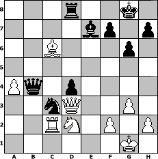 game notation in PGN-format [Event "2. Chess960/1"] [Site "www.myChess.de"] [Date "2008.03.15"] [Round "1"] [White "Knoeppel@"] [Black "Briegel@"] [Variant "Fischerrandom"] [SetUp "1"] [FEN "rqnbbknr/pppppppp/8/8/8/8/PPPPPPPP/RQNBBKNR w KQkq - 0 1"] [WhitemyELO "1500"] [BlackmyELO "1500"] [Result "1/2-1/2"] [TimeControl "10/3456000"] [WhiteDays "130"] [BlackDays "032"] [MyChessNo "43417"] 1. Nf3 c5 2. c4 Nf6 3. d3 O-O 4. O-O a5 5. Bc3 d6 6. Bxf6 exf6 7. e3 f5 8. d4 g6 9. Qc2 Bf6 10. Rb1 Qa7 11. Ne2 b5 12. cxb5 Bxb5 13. Re1 Bc6 14. Ng3 Re8 15. Be2 Ne7 16. dxc5 Rac8 17. Rec1 Bd5 18. Qa4 dxc5 19. b3 Ba8 20. Rc2 Nd5 21. Qc4 Red8 22. Rd1 Qe7 23. a3 Bb7 24. Rdc1 Bg7 25. Nf1 Bf8 26. Rd2 Ra8 27. Ng3 a4 28. bxa4 Bc6 29. Nd4 cxd4 30. Qxc6 Ra7 31. Rc4 Rc7 32. Qb5 Nc3 33. Rxc7 Qxc7 34. Qd3 f4 35. exf4 Bh6 36. Rc2 Bxf4 37. Nf1 Qa5 38. Bf3 Bd6 39. g3 Bxa3 40. Bc6 Be7 41. Nd2 Qb4 1/2-1/2 position notation in FEN-format 3r2k1/4bp1p/2B3p1/8/Pq1p4/2nQ2P1/2RN1P1P/6K1 - - - 4 42 Captured white pieces: Captured black pieces: Click on a captured piece in order to display the desired move!