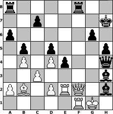 game notation in PGN-format [Event "Ohne techn. Hilfsmittel..."] [Site "www.myChess.de"] [Date "2013.02.13"] [Round "1"] [White "hape50"] [Black "espero"] [ECO "A80"] [WhitemyELO "1323"] [BlackmyELO "1779"] [Result "0-1"] [TimeControl "10/864000"] [WhiteDays "25"] [BlackDays "20"] [MyChessNo "86561"] 1. d4 f5 2. h3 Nf6 3. Nf3 d6 4. e3 g6 5. Bd3 Bg7 6. c3 O-O 7. O-O Nc6 8. Na3 a6 9. b4 b5 10. Bb2 h6 11. Re1 Ne4 12. Nc2 e6 13. Bxe4 fxe4 14. Nh2 d5 15. Qg4 Kh7 16. f4 e5 17. Qg3 exf4 18. exf4 Ne7 19. Ne3 Nf5 20. Qf2 h5 21. g4 Nxe3 22. Rxe3 Bh6 23. g5 Bxg5 24. Qg2 Bxf4 25. Re2 Qh4 26. Rf1 Bxh3 27. Qf2 Bxh2+ 0-1 position notation in FEN-format r4r2/2p4k/p5p1/1p1p3p/1P1Pp2q/2P4b/PB1PRQ1b/5RK1 - - - 0 28 Captured white pieces: Captured black pieces: Click on a captured piece in order to display the desired move!