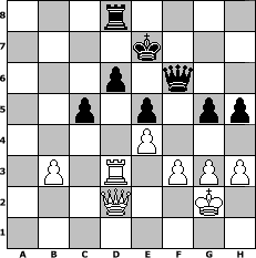 game notation in PGN-format [Event "Februar 2018"] [Site "www.myChess.de"] [Date "2018.02.03"] [Round "1"] [White "Joschi"] [Black "Seneca"] [ECO "B07"] [WhitemyELO "1547"] [BlackmyELO "1426"] [Result "1/2-1/2"] [TimeControl "10/1728000"] [WhiteDays "140"] [BlackDays "097"] [MyChessNo "111239"] 1. e4 d6 2. d4 Nf6 3. Nc3 c6 4. Nf3 Bg4 5. Be2 g6 6. h3 Bd7 7. O-O Bg7 8. Be3 O-O 9. Qd2 a6 10. Bh6 b5 11. Bxg7 Kxg7 12. a3 Qc7 13. Rad1 a5 14. Qe3 e6 15. Rd2 Re8 16. Rfd1 Na6 17. Qd3 Red8 18. d5 b4 19. axb4 Nxb4 20. Qc4 c5 21. dxe6 Bxe6 22. Qb5 Bd7 23. Qc4 Be6 24. Qb5 Rab8 25. Qa4 Ne8 26. b3 Nc6 27. Qa1 Kg8 28. Nb5 Qe7 29. Nc3 f6 30. Bb5 Qc7 31. Bxc6 Qxc6 32. Qxa5 Rd7 33. Qa1 Kf7 34. Qb2 Rb6 35. Ra1 Nc7 36. Ra7 Ra6 37. Rxa6 Nxa6 38. Rd1 Rb7 39. Qa3 Nb4 40. Rc1 Qc7 41. Ne2 Ra7 42. Qb2 Qa5 43. Ne1 Nc6 44. c4 Ne5 45. Nc3 Rb7 46. Nb5 Ke7 47. Ra1 Qb6 48. Qc3 Bd7 49. Nd3 Bxb5 50. cxb5 Qxb5 51. Nxe5 fxe5 52. Rb1 Qb4 53. Qc2 Ra7 54. f3 Qd4+ 55. Kh2 h5 56. Rd1 Qb4 57. Qd3 Qd4 58. Qc2 Qe3 59. Rd3 Qf4+ 60. g3 Qf7 61. Kg2 g5 62. Rd5 Ra8 63. Qd2 Qf6 64. Rd3 Rd8 1/2-1/2 position notation in FEN-format 3r4/4k3/3p1q2/2p1p1pp/4P3/1P1R1PPP/3Q2K1/8 - - - 6 65 Captured white pieces: Captured black pieces: Click on a captured piece in order to display the desired move!