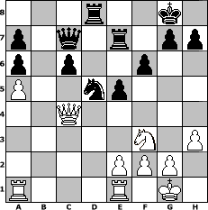 game notation in PGN-format [Event "Evans ist f"] [Site "www.myChess.de"] [Date "2010.08.01"] [Round "2"] [White "Schachking"] [Black "Sanji"] [ECO "C51"] [WhitemyELO "1530"] [BlackmyELO "1527"] [Result "0-1"] [TimeControl "10/3456000"] [WhiteDays "120"] [BlackDays "012"] [MyChessNo "67317"] 1. e4 e5 2. Nf3 Nc6 3. Bc4 Bc5 4. b4 Bxb4 5. c3 Bc5 6. d4 exd4 7. cxd4 Bb4+ 8. Bd2 Bxd2+ 9. Nbxd2 d6 10. Bb5 Bd7 11. Bxc6 Bxc6 12. O-O Nf6 13. d5 Bb5 14. Re1 O-O 15. a4 Ba6 16. h3 Re8 17. Qb3 Re7 18. a5 Qd7 19. e5 dxe5 20. Ne4 Nxd5 21. Red1 c6 22. Nc5 Qc7 23. Nxa6 bxa6 24. Qc4 Rd8 25. Re1 f6 0-1 position notation in FEN-format 3r2k1/p1q1r1pp/p1p2p2/P2np3/2Q5/5N1P/4PPP1/R3R1K1 - - - 0 26 Captured white pieces: ![]() ![]() ![]() ![]() ![]() ![]() ![]() ![]() ![]() ![]() ![]() ![]() ![]() ![]() ![]() Captured black pieces: ![]() ![]() ![]() ![]() ![]() ![]() ![]() ![]() ![]() ![]() ![]() ![]() ![]() ![]() ![]() Click on a captured piece in order to display the desired move!