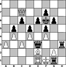 game notation in PGN-format [Event "Zwischendurch mal ein paar eigene Z"] [Site "www.myChess.de"] [Date "2009.02.11"] [Round "1"] [White "Master1"] [Black "rikilatic"] [ECO "D00"] [WhitemyELO "1280"] [BlackmyELO "1386"] [Result "0-1"] [TimeControl "10/1728000"] [WhiteDays "99"] [BlackDays "85"] [MyChessNo "52693"] 1. d4 d5 2. Bf4 Bf5 3. Nc3 c6 4. Nf3 Nf6 5. e3 Qb6 6. Rb1 e6 7. a3 Nbd7 8. Bd3 Ne4 9. O-O Ndf6 10. Nh4 Bg6 11. Qe1 Bd6 12. Nxe4 Bxf4 13. Nxf6+ gxf6 14. Nxg6 Bxh2+ 15. Kxh2 hxg6+ 16. Kg1 O-O-O 17. f3 Rh5 18. Qg3 Qa5 19. c3 Rg5 20. Qh3 Rh5 21. Qg3 Rdh8 22. Kf2 Kd7 23. f4 f5 24. Be2 Rh4 25. Qg5 b5 26. Qf6 Ke8 27. Bf3 Qa4 28. Rg1 Qc2+ 29. Be2 Rh2 30. Qe5 Kd7 31. Qf6 Ke8 32. b4 Qe4 33. Bf3 Qc2+ 34. Be2 Qe4 35. Bf3 Qc2+ 36. Be2 R8h3 37. Qe5 Qd2 38. Qb8+ Ke7 39. Qxa7+ Kf6 40. Rbe1 Qxe3+ 41. Kf1 Rh1 42. Qc7 Rxg1# 0-1 position notation in FEN-format 8/2Q2p2/2p1pkp1/1p1p1p2/1P1P1P2/P1P1q2r/4B1P1/4RKr1 - - - 0 43 Captured white pieces: Captured black pieces: Click on a captured piece in order to display the desired move!
