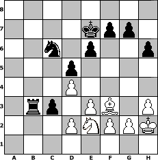 game notation in PGN-format [Event "Gegen die Sommerflaute"] [Site "www.myChess.de"] [Date "2013.07.17"] [Round "1"] [White "reisinger"] [Black "faustballer"] [ECO "D20"] [WhitemyELO "1516"] [BlackmyELO "1537"] [Result "0-1"] [TimeControl "10/864000"] [WhiteDays "40"] [BlackDays "19"] [MyChessNo "89340"] 1. d4 d5 2. c4 dxc4 3. Nc3 c6 4. Bf4 Nf6 5. h3 b5 6. e3 Nd5 7. Nge2 h6 8. Nxd5 cxd5 9. Nc3 a6 10. Be2 Bf5 11. Bf3 e6 12. O-O Bb4 13. a3 Ba5 14. b4 Bc7 15. Bxc7 Qxc7 16. a4 bxa4 17. Qxa4+ Ke7 18. Rfe1 Re8 19. Nb5 Qc6 20. Nc3 Qxa4 21. Rxa4 Bc2 22. Rea1 Bxa4 23. Rxa4 Nc6 24. Kh2 Reb8 25. b5 axb5 26. Rxa8 Rxa8 27. Nxb5 Rb8 28. Nc3 Rb3 29. Ne2 c3 0-1 position notation in FEN-format 8/4kpp1/2n1p2p/3p4/3P4/1rp1PB1P/3PNPPK/8 - - - 0 30 Captured white pieces: Captured black pieces: Click on a captured piece in order to display the desired move!