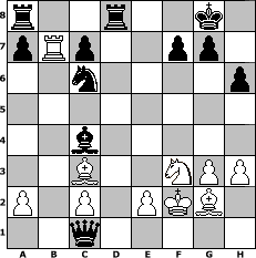 game notation in PGN-format [Event "Verschachert #7"] [Site "www.myChess.de"] [Date "2014.10.08"] [Round "1"] [White "Macks"] [Black "reisinger"] [ECO "A22"] [WhitemyELO "1422"] [BlackmyELO "1457"] [Result "0-1"] [TimeControl "10/1728000"] [WhiteDays "57"] [BlackDays "60"] [MyChessNo "96222"] 1. c4 e5 2. Nc3 Nf6 3. Nf3 Nc6 4. g3 Bc5 5. Bg2 Ng4 6. O-O d6 7. h3 Nxf2 8. Rxf2 Bxf2+ 9. Kxf2 Be6 10. d3 h6 11. d4 exd4 12. Nxd4 Qf6+ 13. Nf3 O-O 14. b3 Qxc3 15. Rb1 Qa5 16. Rb2 d5 17. Bd2 Qa3 18. Bc3 Rfd8 19. Qc1 dxc4 20. bxc4 Bxc4 21. Rxb7 Qxc1 0-1 position notation in FEN-format r2r2k1/pRp2pp1/2n4p/8/2b5/2B2NPP/P1P1PKB1/2q5 - - - 0 22 Captured white pieces: Captured black pieces: Click on a captured piece in order to display the desired move!