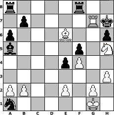 game notation in PGN-format [Event "Bremer Schl"] [Site "www.myChess.de"] [Date "2016.06.18"] [Round "1"] [White "Holzhacker"] [Black "Erich"] [ECO "C24"] [WhitemyELO "2103"] [BlackmyELO "2118"] [Result "1/2-1/2"] [TimeControl "10/3456000"] [WhiteDays "140"] [BlackDays "120"] [MyChessNo "103952"] 1. e4 e5 2. Bc4 Nf6 3. d3 c6 4. Nf3 d5 5. exd5 cxd5 6. Bb3 Nc6 7. O-O Bd6 8. Nc3 Be6 9. Bg5 Bc7 10. Re1 O-O 11. h3 a6 12. Bh4 h6 13. Bxf6 gxf6 14. d4 e4 15. Nh4 f5 16. Nxd5 Ba5 17. Qh5 Qg5 18. Re3 Kh7 19. f4 Qxh5 20. Nf6+ Kh8 21. Nxh5 Nxd4 22. Bxe6 Nxc2 23. Rg3 Nxa1 24. Ng6+ fxg6 25. Rxg6 Kh7 26. Rg7+ Kh8 27. Rg6 Kh7 28. Rg7+ Kh8 29. Rg6 Kh7 30. Rg7+ 1/2-1/2 position notation in FEN-format r4r2/1p4Rk/p3B2p/b4p1N/4pP2/7P/PP2P1P1/n5K1 - - - 10 30 Captured white pieces: ![]() ![]() ![]() ![]() ![]() ![]() ![]() ![]() ![]() ![]() ![]() ![]() ![]() ![]() ![]() Captured black pieces: ![]() ![]() ![]() ![]() ![]() ![]() ![]() ![]() ![]() ![]() ![]() ![]() ![]() ![]() ![]() Click on a captured piece in order to display the desired move!