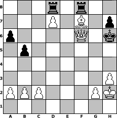 game notation in PGN-format [Event "Ohne techn. Hilfsmittel..."] [Site "www.myChess.de"] [Date "2013.02.13"] [Round "1"] [White "Naunhofer"] [Black "muellerh"] [ECO "C41"] [WhitemyELO "1667"] [BlackmyELO "1535"] [Result "1-0"] [TimeControl "10/864000"] [WhiteDays "40"] [BlackDays "20"] [MyChessNo "86527"] 1. e4 e5 2. Nf3 d6 3. d4 Nc6 4. Bc4 Bg4 5. h3 Bxf3 6. Qxf3 Nf6 7. d5 Nd4 8. Qd3 a6 9. f4 b5 10. fxe5 dxe5 11. Bb3 Nh5 12. O-O Bc5 13. Be3 Nf4 14. Qd2 Nfe2+ 15. Kh2 Qh4 16. Bf2 Qxe4 17. Nc3 Nxc3 18. Qxc3 O-O 19. Qxc5 Qf4+ 20. Bg3 Qg5 21. Rae1 Rae8 22. Qxc7 Nf5 23. Bxe5 Rc8 24. Qd7 Ne3 25. Rxe3 Qxe3 26. Qf5 Qh6 27. d6 Rcd8 28. Bxf7+ Kh8 29. d7 Qb6 30. Bxg7+ Kxg7 31. Qe5+ Kh6 32. Rf6+ Qxf6 33. Qxf6# 1-0 position notation in FEN-format 3r1r2/3P1B1p/p4Q1k/1p6/8/7P/PPP3PK/8 - - - 0 33 Captured white pieces: Captured black pieces: Click on a captured piece in order to display the desired move!
