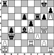 game notation in PGN-format [Event "Sei dabei am 1. Mai"] [Site "www.myChess.de"] [Date "2009.04.26"] [Round "1"] [White "Knight"] [Black "Plaidroller"] [ECO "C24"] [WhitemyELO "1059"] [BlackmyELO "1799"] [Result "0-1"] [TimeControl "10/2592000"] [WhiteDays "29"] [BlackDays "30"] [MyChessNo "55222"] 1. e4 e5 2. Bc4 Nf6 3. d4 exd4 4. Qxd4 Nc6 5. Qe3 d6 6. Nc3 Ne5 7. Bb3 Be6 8. Bxe6 fxe6 9. Nf3 Nxf3+ 10. Qxf3 e5 11. Bg5 Be7 12. O-O-O O-O 13. Bxf6 Rxf6 14. Qg3 c6 15. h4 Rg6 16. Qh2 Qa5 17. h5 Rf6 18. Qg3 b5 19. h6 g6 20. Kb1 b4 21. Ne2 Qb5 22. Rde1 a5 23. b3 a4 24. Nc1 axb3 25. cxb3 Bd8 26. Qg4 c5 27. f3 c4 28. Re3 Bb6 29. Ree1 cxb3 30. Nxb3 Qd3+ 31. Ka1 Qxb3 32. Re2 Bd4+ 0-1 position notation in FEN-format r5k1/7p/3p1rpP/4p3/1p1bP1Q1/1q3P2/P3R1P1/K6R - - - 2 33 Captured white pieces: Captured black pieces: Click on a captured piece in order to display the desired move!