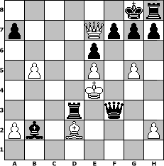 game notation in PGN-format [Event "dazwischen"] [Site "www.myChess.de"] [Date "2010.10.19"] [Round "1"] [White "Knight"] [Black "Haneken"] [ECO "D00"] [WhitemyELO "1199"] [BlackmyELO "1545"] [Result "0-1"] [TimeControl "10/2592000"] [WhiteDays "88"] [BlackDays "61"] [MyChessNo "69199"] 1. d4 d5 2. e4 dxe4 3. Nc3 Nf6 4. f3 Bf5 5. g4 Bg6 6. g5 Nd5 7. Nxe4 Nc6 8. Bb5 e6 9. b3 Bb4+ 10. Bd2 Ne3 11. Qc1 Bxe4 12. fxe4 Ba3 13. Qb1 Qxd4 14. Nf3 Nxc2+ 15. Qxc2 Qxa1+ 16. Ke2 Qxh1 17. Bxc6+ bxc6 18. Qxc6+ Ke7 19. Qxc7+ Kf8 20. b4 Bb2 21. b5 Kg8 22. e5 Qg2+ 23. Ke3 Qf1 24. Qb7 Rd8 25. Qe7 Rd3+ 26. Ke4 Qxf3# 0-1 position notation in FEN-format 6kr/p3Qppp/4p3/1P2P1P1/4K3/3r1q2/Pb1B3P/8 - - - 0 27 Captured white pieces: Captured black pieces: Click on a captured piece in order to display the desired move!