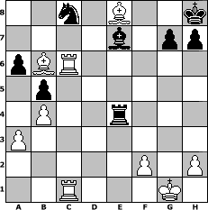 game notation in PGN-format [Event "Only for friends"] [Site "www.myChess.de"] [Date "2005.02.24"] [Round "1"] [White "Seneca"] [Black "Andylein1989"] [ECO "D06"] [WhitemyELO "1523"] [BlackmyELO "1257"] [Result "1-0"] [TimeControl "10/1728000"] [WhiteDays "20"] [BlackDays "16"] [MyChessNo "10652"] 1. d4 d5 2. c4 Nf6 3. Nf3 Bg4 4. e3 Nc6 5. Nc3 Bxf3 6. Qxf3 e6 7. a3 Be7 8. Bd3 O-O 9. O-O a6 10. Bd2 Rb8 11. b4 Na7 12. cxd5 Nxd5 13. Nxd5 Qxd5 14. Be4 Qb5 15. Rac1 c6 16. Rc3 f5 17. Bd3 Qd5 18. Bc4 Qxf3 19. Bxe6+ Kh8 20. gxf3 b5 21. Bd7 Rf6 22. Rfc1 Rb6 23. e4 fxe4 24. fxe4 Rd6 25. Be8 Rxd4 26. Be3 Rxe4 27. Bxb6 Nc8 28. Rxc6 1-0 position notation in FEN-format 2n1B2k/4b1pp/pBR5/1p6/1P2r3/P7/5P1P/2R3K1 - - - 0 28 Captured white pieces: Captured black pieces: Click on a captured piece in order to display the desired move!