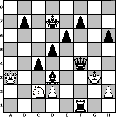game notation in PGN-format [Event "unter uns Nr. 25 Adventturnier"] [Site "www.myChess.de"] [Date "2014.11.29"] [Round "2"] [White "S04boy"] [Black "wiesel"] [ECO "D02"] [WhitemyELO "1500"] [BlackmyELO "1197"] [Result "0-1"] [TimeControl "10/864000"] [WhiteDays "46"] [BlackDays "31"] [MyChessNo "96903"] 1. d4 d5 2. Nf3 e6 3. Nc3 Nc6 4. a3 Nf6 5. Bg5 h6 6. Bxf6 Qxf6 7. Nb5 Qd8 8. Ne5 Nxe5 9. dxe5 Bd7 10. e3 a6 11. Nd4 c5 12. Nf3 c4 13. c3 Bc5 14. b4 Be7 15. a4 a5 16. bxa5 Rxa5 17. Rb1 Bxa4 18. Qd4 Bc5 19. Qh4 Qc7 20. Be2 Be7 21. Qg4 g5 22. O-O Bc2 23. Ra1 Bf5 24. Qh5 Bg6 25. Qh3 Ra6 26. Nd4 Qb6 27. Rfb1 Bxb1 28. Rxa6 Qxa6 29. g4 Be4 30. Qf1 Qa3 31. Nb5 Qa5 32. Bf3 Bxf3 33. Nd4 Be4 34. f3 Bd3 35. Qc1 Ba3 36. Qa1 Kd7 37. f4 gxf4 38. exf4 Rg8 39. Qa2 Rxg4+ 40. Kf2 Rxf4+ 41. Kg3 Rf1 42. Nc2 Qxc3 43. Qxa3 Qxe5+ 44. Kg2 Qe4+ 45. Kg3 Qf4+ 0-1 position notation in FEN-format 8/1p1k1p2/4p2p/3p4/2p2q2/Q2b2K1/2NP3P/5r2 - - - 4 46 Captured white pieces: Captured black pieces: Click on a captured piece in order to display the desired move!