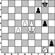 game notation in PGN-format [Event "my schach.de darf nicht einschlafen!!"] [Site "www.myChess.de"] [Date "2018.08.17"] [Round "2"] [White "Seneca"] [Black "sprinterde"] [ECO "C20"] [WhitemyELO "1469"] [BlackmyELO "1722"] [Result "0-1"] [TimeControl "10/1728000"] [WhiteDays "20"] [BlackDays "20"] [MyChessNo "112921"] 1. e4 e5 2. d3 Nc6 3. Nf3 d6 4. Bd2 Nf6 5. Be2 Be7 6. O-O Bg4 7. c3 O-O 8. h3 Bh5 9. b4 h6 10. a4 Qd7 11. Nxe5 Nxe5 12. Bxh5 Nh7 13. d4 Nc4 14. Bg4 Qd8 15. Bc1 Nb6 16. Qd3 c6 17. a5 Nd7 18. Be3 Re8 19. Nd2 Ndf6 20. Bf3 Nd7 21. c4 Ng5 22. Be2 c5 23. bxc5 dxc5 24. d5 Bf6 25. f3 Bxa1 26. Rxa1 Qf6 27. Nb3 Ne5 28. Qd2 Ngxf3+ 29. gxf3 Nxf3+ 30. Bxf3 Qxf3 31. Nxc5 Qg3+ 32. Kf1 Qxh3+ 33. Ke2 Qg2+ 34. Kd3 Qf3 35. Qf2 Qxf2 36. Bxf2 Re7 37. Rb1 Rb8 38. Bd4 b6 39. axb6 axb6 40. Na6 Rbe8 41. e5 h5 42. Rxb6 Ra8 43. Rb8+ Rxb8 44. Nxb8 h4 45. Nc6 Rb7 46. Bg1 h3 47. Nd4 g5 48. Ke4 Rb1 49. Ne2 Rxg1 50. Nxg1 h2 0-1 position notation in FEN-format 6k1/5p2/8/3PP1p1/2P1K3/8/7p/6N1 - - - 0 51 Captured white pieces: Captured black pieces: Click on a captured piece in order to display the desired move!
