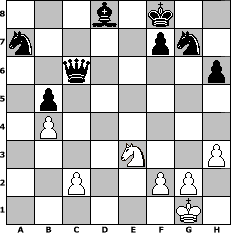 game notation in PGN-format [Event "MY HAIR IS ON FIRE!"] [Site "www.myChess.de"] [Date "2020.03.29"] [Round "1"] [White "Haneken"] [Black "Gauss1233"] [ECO "C20"] [WhitemyELO "1116"] [BlackmyELO "1483"] [Result "0-1"] [TimeControl "10/2592000"] [WhiteDays "30"] [BlackDays "30"] [MyChessNo "117830"] 1. e4 e5 2. d3 Nf6 3. Nf3 Nc6 4. Be2 Bc5 5. O-O O-O 6. Bg5 h6 7. Bh4 d6 8. h3 a6 9. Nc3 Be6 10. a3 b5 11. b4 Bb6 12. Qd2 Na7 13. a4 c6 14. axb5 axb5 15. d4 exd4 16. Nxd4 Qe7 17. Bf3 Bc4 18. Nf5 Qc7 19. Rfd1 Ne8 20. Be7 d5 21. Bxf8 Kxf8 22. exd5 cxd5 23. Bxd5 Rd8 24. Qe1 Bxd5 25. Nxd5 Qb7 26. Qc3 Rxd5 27. Qxg7+ Nxg7 28. Ne3 Rxd1+ 29. Rxd1 Qc6 30. Rd8+ Bxd8 0-1 position notation in FEN-format 3b1k2/n4pn1/2q4p/1p6/1P6/4N2P/2P2PP1/6K1 - - - 0 31 Captured white pieces: Captured black pieces: Click on a captured piece in order to display the desired move!