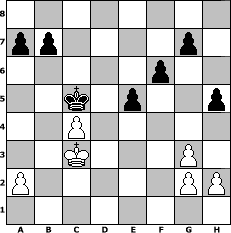 game notation in PGN-format [Event "1. Chess960/6"] [Site "www.myChess.de"] [Date "2007.03.01"] [Round "1"] [White "Ziegert"] [Black "Offi@ (adv.)"] [Variant "Fischerrandom"] [SetUp "1"] [FEN "rbqkbrnn/pppppppp/8/8/8/8/PPPPPPPP/RBQKBRNN w KQkq - 0 1"] [WhitemyELO "1500"] [BlackmyELO "1500"] [Result "0-1"] [TimeControl "10/3456000"] [WhiteDays "087"] [BlackDays "159"] [MyChessNo "33172"] 1. d4 Ng6 2. Nf3 c5 3. c3 Nf6 4. Bd2 cxd4 5. cxd4 Qxc1+ 6. Bxc1 d5 7. O-O Bb5 8. Re1 O-O 9. Ng3 Rc8 10. Nf5 e6 11. Ng3 Bd6 12. e4 Bxg3 13. fxg3 dxe4 14. Bxe4 Nxe4 15. Rxe4 Ne7 16. Ne1 Rd8 17. Be3 Bc6 18. Re5 Nf5 19. Nc2 f6 20. Rc5 Nxe3 21. Nxe3 Rxd4 22. Rc2 Rad8 23. Rac1 h5 24. Rf2 Kf7 25. Nc4 Rxc4 26. Rxc4 Rd1+ 27. Rf1 Rxf1+ 28. Kxf1 Bb5 29. b3 Bxc4+ 30. bxc4 Ke7 31. Ke2 Kd6 32. Kd3 Kc5 33. Kc3 e5 0-1 position notation in FEN-format 8/pp4p1/5p2/2k1p2p/2P5/2K3P1/P5PP/8 - - - 0 34 Captured white pieces: Captured black pieces: Click on a captured piece in order to display the desired move!