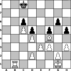 game notation in PGN-format [Event "wie w"] [Site "www.myChess.de"] [Date "2013.11.16"] [Round "1"] [White "reisinger"] [Black "Wulfen49"] [ECO "D30"] [WhitemyELO "1507"] [BlackmyELO "1356"] [Result "1-0"] [TimeControl "10/1728000"] [WhiteDays "20"] [BlackDays "20"] [MyChessNo "91144"] 1. d4 d5 2. c4 e6 3. Bf4 Nf6 4. Nc3 Bb4 5. e3 Bxc3+ 6. bxc3 O-O 7. h3 Ne4 8. Qc2 Nc6 9. cxd5 exd5 10. Bd3 Bf5 11. f3 Ng3 12. Bxg3 Bxd3 13. Qxd3 Qe7 14. Ne2 Rfe8 15. Bf2 Na5 16. Ng3 Nc4 17. Nf5 Qe6 18. O-O Nd6 19. Nxd6 Qxd6 20. c4 Re7 21. c5 Qc6 22. Rab1 Rae8 23. Rb3 b6 24. Rc1 b5 25. Rxb5 a6 26. Ra5 Rb8 27. Rxa6 Qb7 28. Qa3 c6 29. Rb6 Qc8 30. Rcb1 Ra8 31. Qxa8 Qxa8 32. Rb8+ Re8 33. Rxa8 Rxa8 34. a4 f6 35. Ra1 Kf7 36. Bg3 Ke6 37. a5 h5 38. a6 f5 39. a7 g6 40. Bb8 Kd7 41. Rb1 Rxa7 42. Bxa7 Kc7 43. Bb8+ Kc8 44. Bf4 1-0 position notation in FEN-format 2k5/8/2p3p1/2Pp1p1p/3P1B2/4PP1P/3P2P1/1R4K1 - - - 4 44 Captured white pieces: Captured black pieces: Click on a captured piece in order to display the desired move!