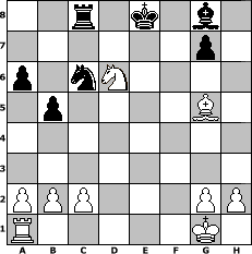 game notation in PGN-format [Event "Sweschnikow II"] [Site "www.myChess.de"] [Date "2012.04.28"] [Round "2"] [White "kari6katz"] [Black "Joschi"] [ECO "B33"] [WhitemyELO "1756"] [BlackmyELO "1651"] [Result "1-0"] [TimeControl "10/1728000"] [WhiteDays "19"] [BlackDays "19"] [MyChessNo "81327"] 1. e4 c5 2. Nf3 Nc6 3. d4 cxd4 4. Nxd4 Nf6 5. Nc3 e5 6. Ndb5 d6 7. Nd5 Nxd5 8. Qxd5 Be6 9. Qd1 Be7 10. Be2 a6 11. Nc3 O-O 12. O-O b5 13. f4 f5 14. Bd3 fxe4 15. Bxe4 Rc8 16. Qh5 h6 17. Qg6 Rf6 18. Qh7+ Kf7 19. Bg6+ Rxg6 20. fxe5+ Bf6 21. exf6 Rxf6 22. Bxh6 Qg8 23. Rxf6+ Kxf6 24. Ne4+ Ke7 25. Bg5+ Ke8 26. Qxg8+ Bxg8 27. Nxd6+ 1-0 position notation in FEN-format 2r1k1b1/6p1/p1nN4/1p4B1/8/8/PPP3PP/R5K1 - - - 0 27 Captured white pieces: Captured black pieces: Click on a captured piece in order to display the desired move!
